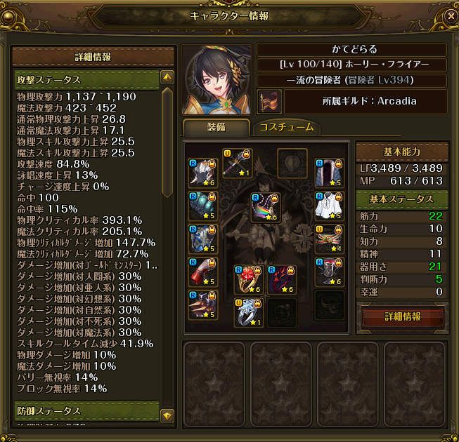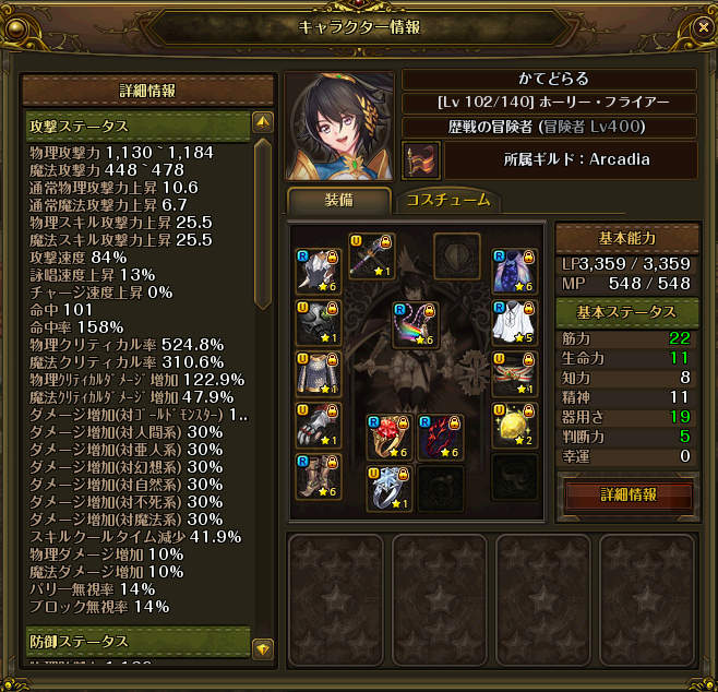 あ、フィーバー装備箱を使ってミスリル・メッシュはゲットしました。物魔-25%を引いたのですがクリ率が欲しくて結局ギルメンに売ってもらいました。UOP付与したけどゴミだったのと現R5鎧にリベレーションのCT減がついているのでこれまた装備せずに保留。使えるUOP引かないと中々変更しづらいです。装備を集めてはいるものの使っていないので7月8月でほぼ変化がありません(実は「身になる果実」も装備するとノーダメ維持出来ないのでソロ狩りでしか使っていません)。