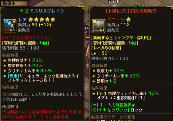 4つ目のU装備となる肩防具を露店で購入。しかしその後夏のホットボックスがドロップし、肩防具を引き被ってしまう。古代肩の下落がすさまじくしばらく保管して値が戻らなければサブで使うことを検討。